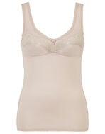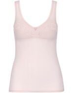 肌側が綿100%のソフトな綿混素材のカップ付きノースリーブ。後ろアンダーバスト部をゴム仕様にすることで、安定感のある着ごこち。カップ部にさりげなくレースをあしらい、ほんのりエレガントな表情に仕上げました。