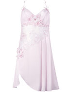 日常をラグジュアリーに彩る、美しいランジェリードレス。アカンサス文様をあしらったバラのアップリケには上品に輝くスワロフスキー・クリスタルを飾りました。透ける肌に浮き立つレースが優雅な印象に。大胆にあいたバックスタイルと、まるで背中に羽根が生えたような首もとのデザインが特別感を演出。ディテールにこだわったゴージャスな一枚です。