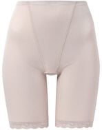 ガードル初心者さんにもおすすめの、やさしい着用感でぽっこりおなかを押さえられるソフトパワーのガードル。太ももまでカバーするロング丈なので、ヒップラインもすっきり。身生地部はやわらかな肌ざわりの綿混素材を使い、フロント中央にあしらったあて布で、おなかをやさしくサポート。裾は肌あたりのやさしいレース使いでアウターにひびきにくく、パンツスタイルをきれいに決めたい日におすすめです。