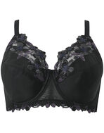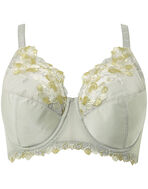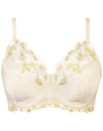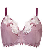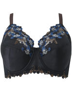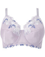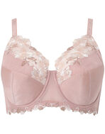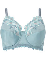 バストをすっぽり包みこんでしっかりホールドしたいフルカップ派さんの定番ブラを、胸もとに咲き誇る刺繍レースの花々でいっそう華やかに。肌側が綿混素材のやわらかな薄手のカップでバストを包みこみ、しっかりした安定感とやさしいフィット感を両立しました。カップ上辺の伸びやかなストレッチレースと肌側のゴムが、上胸になじんでぴったりフィット。カップ肌側の脇パーツや幅広のサイド設計で、ほどよくすっきりしたシルエットにととのえます。