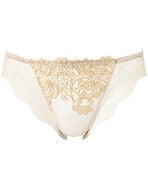 立体的なステッチが目を引くアラベスク調モチーフの刺繍がエレガント。大人の洗練スタイルを演出する華やかなレース使い