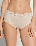 ウエスト部分に美しいフランス製のレースをあしらった、モダンクラシックな雰囲気のはきこみ丈ふかめのショーツ。