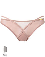 交差するパイピングが輪郭を際立たせるセンシュアルなTバックショーツ。レースを使用せず、シンプルな生地の質感を生かした透け感のグラデーションが美しさを引き立てます。フロントから立体的にあしらわれたX形状の大胆な切り替えラインがポイント。造形美が研ぎ澄まされたシルエットを描き出す存在感のある一枚。