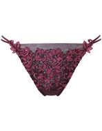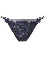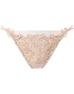 贅沢にあしらわれたケミカルレースのコントラストが優美なショーツ。フロント全体を彩る竹細工のような網模様のレースが繊細かつモダンな印象に。躍動感のある美しい曲線がラグジュアリーな魅力を際立たせます。アップリケからつながる二重の華奢なループがセクシーなバックデザイン。中央のクロスが甘さと上品さを引き立てるポイントです。