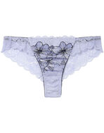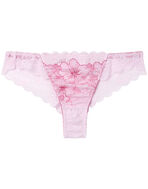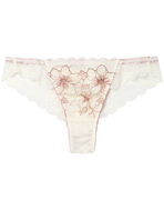 ●フロントにレースをあしらい、サイドからバックにかけてストレッチラッセルレースで仕立てた華やかなソング(Tバックショーツ)。