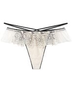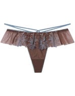 ●フロントはレースをあしらい、裏打ち付きで透けにくい、使いやすいソング(Tバックショーツ)。