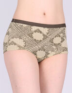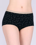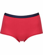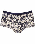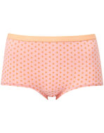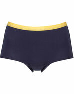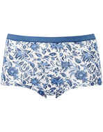 デイリーに活躍するシンプルデザインのカジュアルなボーイレングスショーツ。綿混素材のここちよい着用感です。少し太めに設計されたウエストのゴムがアクセント。無地タイプはモダンなバイカラー仕様にしました。華やかなプリント柄タイプは多彩なバリエーションで選ぶのが楽しくなるラインアップ。大切な方へのプレゼントにもおすすめです。