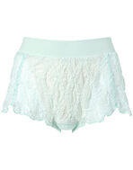 リラックスしたいひとときをおしゃれに彩るショーツ。お部屋にいるときくらい幻想的な気分でいたいという方におすすめです。裾がひらりとしたフレアデザインが、華やかさを演出。綿あめのようにふんわりとしたレースがロマンティックな気持ちにしてくれます。ペアデザインのナイトアップブラ(BXB168)とのコーディネイトで、ルームウェアのように可憐な印象へ。