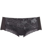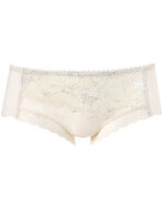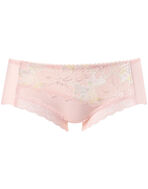 「SUHADA ONE(BXB411)」とペアコーデが楽しめるボーイレングスショーツ。バックはフリーカッティング素材でヒップにくいこみにくく、アウターにひびきにくい。レースはカラーによって選べる3タイプのプリントを展開。