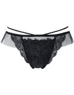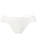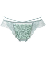 可憐な小花とリーフを描いた、ノスタルジックな雰囲気のケミカルレースが美しいTバックショーツ。脚まわりにはラッセルレースで華やかさをプラス。サイドからバックにかけてのフリルがふわりと揺れる軽やかなデザイン。ウエストの華奢なループ使いもポイントです。
