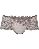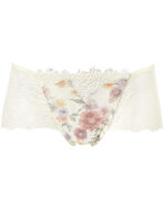 フロントにほどこされたレトロポップな花柄のケミカルレースが贅沢で華やかなボーイレングスショーツ。繊細な細番手の糸を使ったインケミカルレースが透明感を演出。WH・YEカラーにはプリントをあしらい華やかさを一層引き立てます。バックは総レース仕様で、クールになりがちなボーイレングスもゴージャスに。ローライズデニムなどとコーディネイトしやすいのもポイントです。
