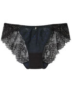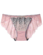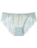 ●フロントに繊細なエンブロイダリーレースをほどこし、バックまで抜け感のあるレースをあしらった、贅沢な印象のデザインショーツ。