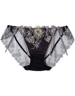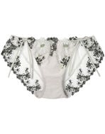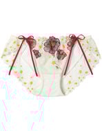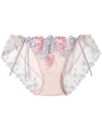 ●フロントにはエンブロイダリーレースをあしらい、バックまで透け感のあるチュールとエンブロイダリーレースを使った華やかな印象のデザインショーツ。