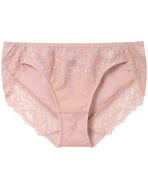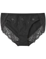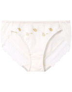 ●前身にエンブロイダリーレースをほどこした、エレガントなデザインのショーツ。