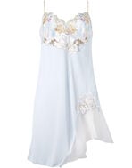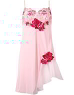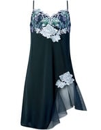 ドレスのような優雅さに心躍るスリップ。額縁をモチーフにした曲線が豊かな色彩の花々を引き立て、まるで絵画を見ているような気分に。神秘的な美しさをもつアルバローズをイメージしたアップリケをほどこした贅沢な一枚です。ドレープをほどこした裾のカッティングが上品なアクセントに。背中部分の大胆なデザインがゴージャスなバックスタイル。心華やぐ鮮やかなカラーが日々に彩りをプラスするアイテムです。
