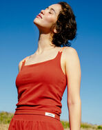 伸びのよい編み立て成型のニット生地は切り替えの接ぎがないので肌当たりが良いカップインキャミソール