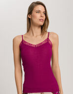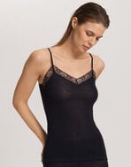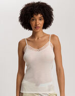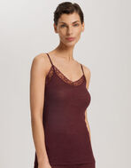 胸もとから脇下まで贅沢にあしらわれたジャカードレースが繊細で美しいキャミソール