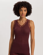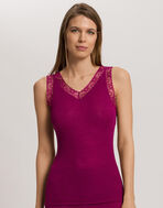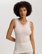 胸もととアームホールにあしらわれたジャカードレースが繊細で美しいタンクトップ