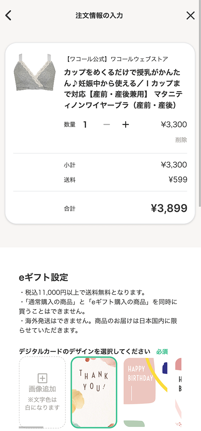 ご注文時、また受け取りURLよりご入力いただたお名前やご住所などのお客様情報は、eギフトサービス提供元「AnyReach」、「ワコールウェブストア」にて、お支払いや商品の確認などに利用させていただく場合がございます。