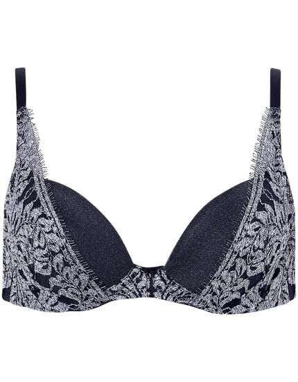 こんにちは!<br>Yueから春夏シーズンらしい爽やかなシリーズが登場しました!<br><br>こちらのシリーズがモチーフにしたのはデニム。<br>染まり具合の異なる糸を組み合わせて織り上げたレースで、デニムの質感を表しました。<br>上にはエレガントなレースを重ね、カジュアルすぎないYueらしいデザインです。<br><br>自然な丸みのあるシルエットに仕上がり、バージスラインに合いやすいワイヤーを使用しています。<br>バック部は折り返し始末で、圧迫感が少ないのも嬉しいポイントです。<br><br>実際に着用してみました!<br>ほどよい寄せ感と、ぴったっとフィットする気持ちよさを実感しました。<br>さらに、自然な丸みのあるシルエットでキレイに仕上がりました。<br>使用しているレースは凹凸が少ないので、Tシャツなどを着用する際にもおすすめだと感じます。<br><br>私はいつものサイズでピッタリでした!<br>サイズ感には個人差があります。<br>ぜひ取り扱い店舗でお試しください♪