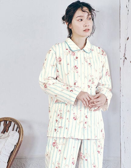 このパジャマ、発注会にいったときに「めっちゃかわいい〜♡」って思いました(トコ太の好みとはぜんぜんちがうんですが(笑))<br><br>なんだか子どもの頃着ていたパジャマのような懐かしい柄で〜なんとなくほっこり(*´ー`*)<br><br><br>こんなのさがしてはる人いるよな〜って思ってたら、入荷してすぐ「かわいい〜♡春らしくていい!」とさっそくお求めいただけました(ちなみにトコ太世代(笑))<br><br>店頭では、さわやかなMEカラーが人気です!<br><br>シャープになりすぎないやさしいストライプに、ローズモチーフのロマンティックなパジャマ<br>えりやポケットのパイピングもアクセントになっていい╰(*´︶`*)╯<br><br><br>見た目だけでなく、こんないいトコもあるんです☆<br><br>★綿100%の二重ガーゼ素材で、ふんわりやさしい肌ざわり<br><br>★吸汗速乾性があるので、汗をかいても乾きやすい!<br><br>★通気性がよくて、さらっと〜<br><br>★ボタンまでかわい〜い♡前あきパジャマ(写真4枚目)<br><br>★ポケットは身ごろに2つありま〜す<br><br><br>新しいパジャマで気分をあげて、春を楽しんでみませんか?<br><br>母の日のプレゼントにもオススメです‼︎<br><br><br>同じ柄のネグリジェもありますよ〜☆