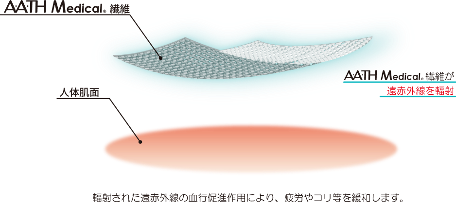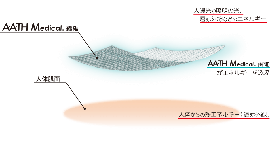 アースメディカル®パウダー(数種類の⾦属を含む微細粒⼦)を練り込んだ特殊繊維が、太陽・照明・⼈体などから発せられる遠⾚外線のエネルギーを吸収。