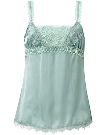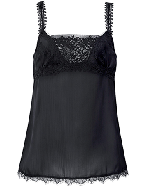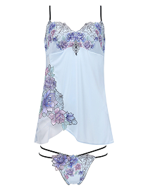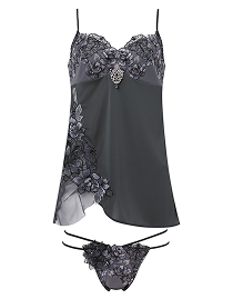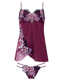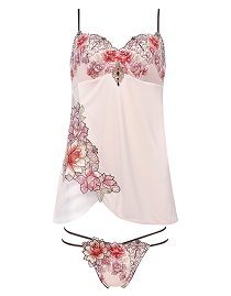 なめらかなスムース素材のキャミソールと、バックに大きなアップリケを飾ったTバックショーツのセットアップ。