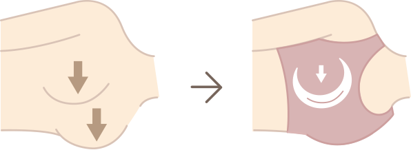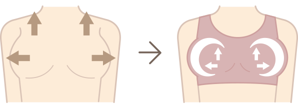 ナイトアップブラを着用すると、仰向けで寝ているときは、脇や上部に流れるバストを、横向きに寝ているときは、前中心に流れるバストを適正な位置に安定させてくれます。