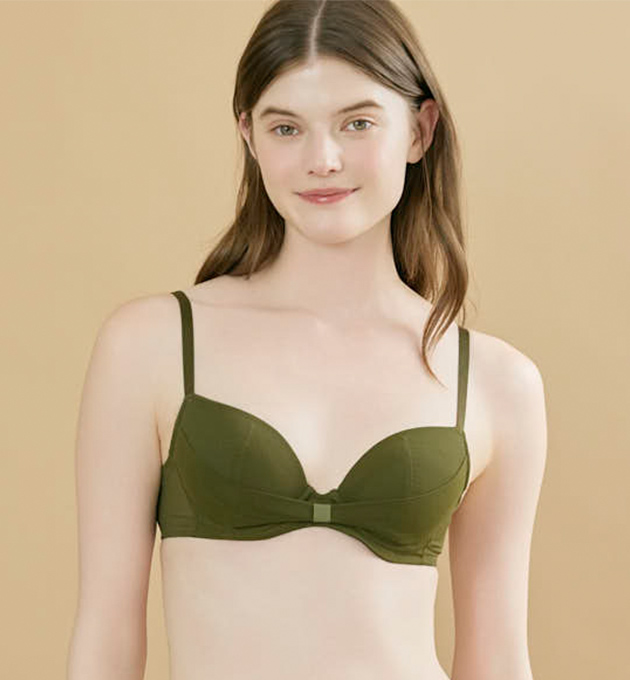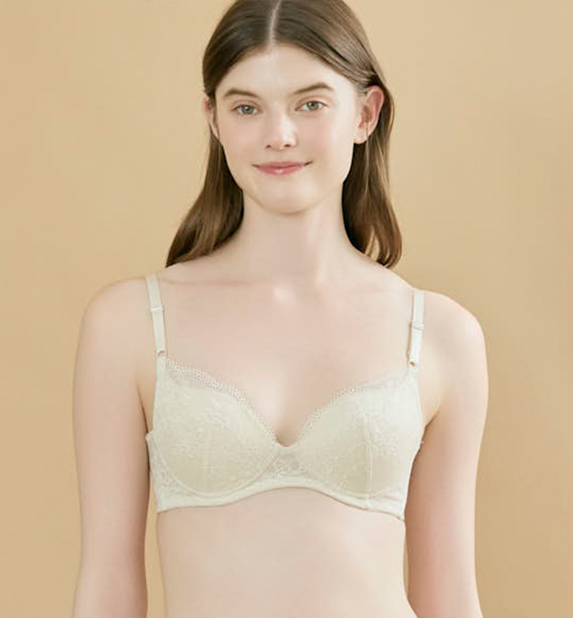 サイズに合わせた設計で、どのサイズでもここちよいフィット感ときれいなシルエットに。前中心の低いワイヤーを使い脇寄せを強くすることで、胸の谷間を美しく見せてくれます。